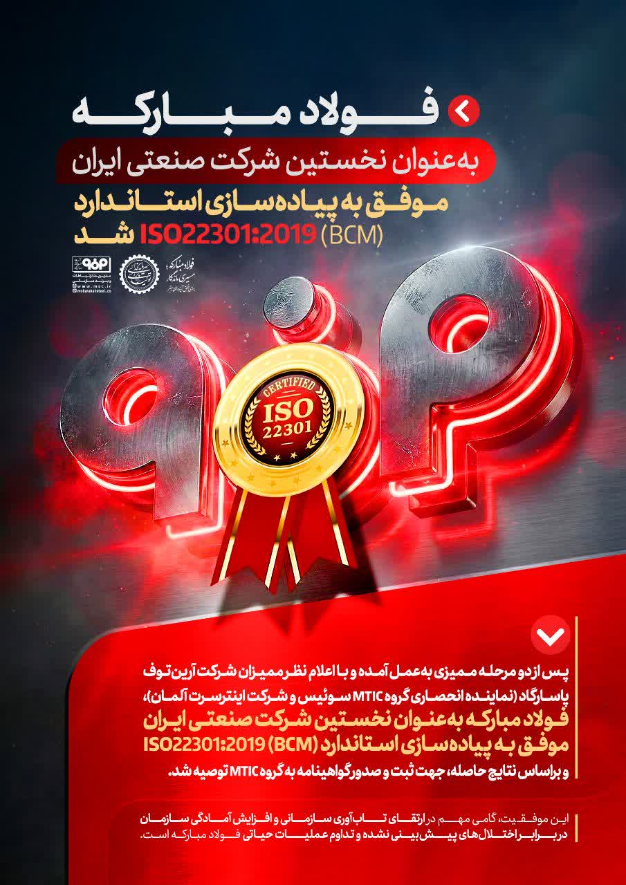 🔹 پس از دو مرحله ممیزی بهعمل آمده و با اعلام نظر ممیزان شرکت آرینتوف پاسارگاد (نماینده انحصاری گروه MTIC سوئیس و شرکت اینترسرت آلمان)، فولاد مبارکه بهعنوان نخستین شرکت صنعتی ایران موفق به پیادهسازی استاندارد (BCM) ISO22301:2019 و براساس نتایج حاصله، جهت ثبت و صدور گواهینامه به گروه MTIC توصیه شد.